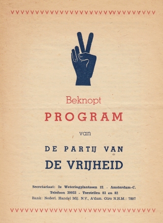 27. PARTIJ VAN DE VRIJHEID Beknopt program van de Partij van de Vrijheid. Den Haag, PVV, [ca. 1946]. Vouwblad, gedrukt in blauw en rood. Vergeeld.