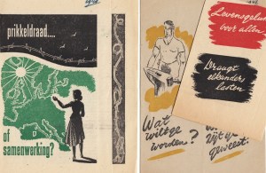 * Inventief strooibiljet dat op twee manieren gevouwen kan worden, wellicht een ontwerp van de kunstenaar Bach Schuurmans (1906-2001), die meer drukwerk voor de vroege P.v.d.A. verzorgde. Promotie voor minister van Financiën Piet Lieftinck, prominent P.v.d.A.-lid, die op ‘kundige en vooruitstrevende wijze onze nationale dubbeltjes beheerde!’
