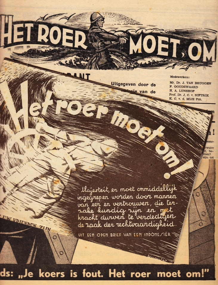 * Fel pamflet van de oud-militair en ontdekkingsreiziger in Nieuw-Guinea Dr. W.K.H. Feuilletau de Bruyn (1886-1972) tegen onafhankelijkheid van Indonesië. Hij was betrokken bij het tussen de partijen staande Nationaal Comité Handhaving Rijkseenheid en stelde zich – vergeefs – met een eigen lijst kandidaat voor de Tweede Kamer van 1948.