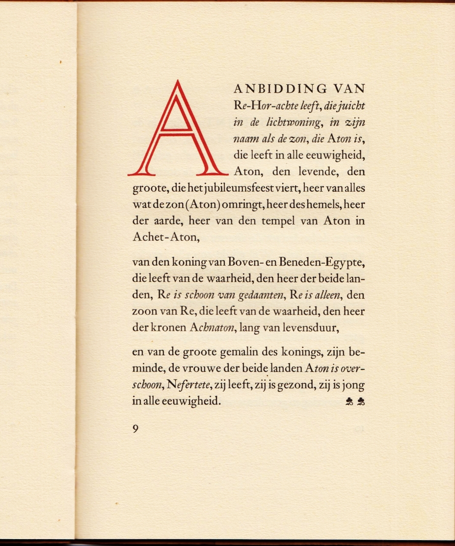 1. ACHNATON Het zonnelied van Achnaton. (Vertaald door prof. dr. A. de Buck en met een nawoord van prof. Theo van Baaren). (Utrecht), Stichting De Roos, 1977. Ingenaaid met omslag. (4), 24 p. Gezet uit de Janson en Romanée en gedrukt door de Carlinapers in blauw, rood en zwart op Eenhoorn in een oplage van 175 genummerde exemplaren. Omslag zoals meestal wat verkleurd, maar een keurig exemplaar.