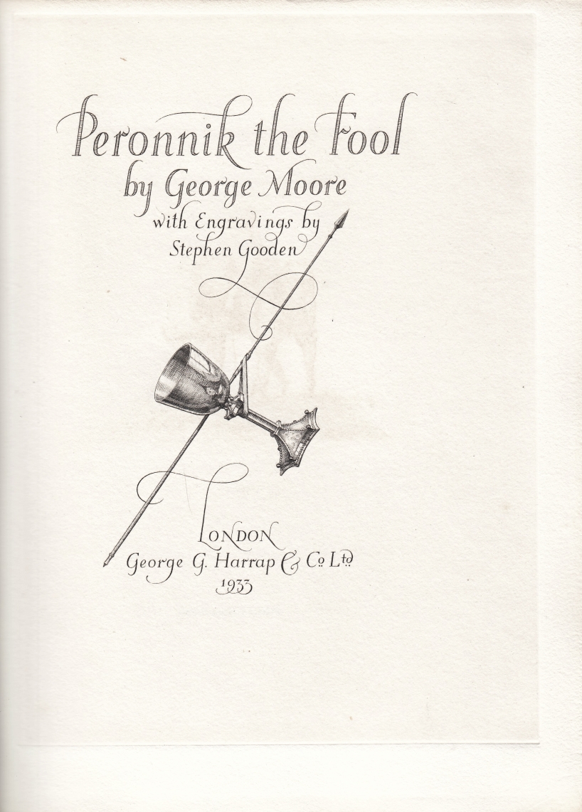 29. MOORE, George Peronnik the Fool. With Engravings by Stephen Gooden. London, George G. Harrap, 1933. Perkament met goudopdruk. 80 p. Met 9 originele kopergravures van Stephen Gooden. Gedrukt in 525 genummerde exemplaren. Goud op de rug iets vervaagd, maar een goed exemplaar.