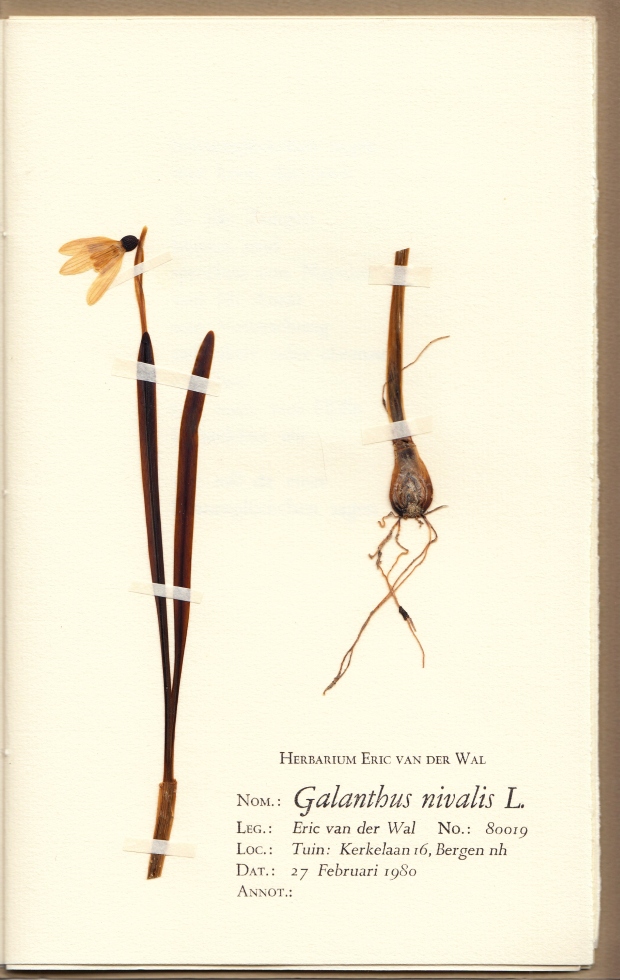 49. (WAL, Eric van der). BESCH, Lutz Schneeglöckchen sagen. (Bergen NH, Eric van der Wal, 1980). Cahiersteek. (24) p. Gezet uit de Romulus en gedrukt op Cream Laid Book Paper van T.H. Saunders in 75 genummerde exemplaren. Met meegevlochten twee gedroogde sneeuwklokjes, beschermd met afdekpapier. Titelpagina in rood en zwart. 1e druk. Keurig.
