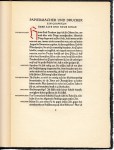 32. RENKER, Armin Papiermacher und Drucker. Ein Gespräch über alte und neue Dinge. Mainz, Gutenberg-Gesellschaft, 1934. Cahiersteek. 24 p. Gedrukt naar ontwerp van Christian Kleukens in rood en zwart op getint geschept papier.