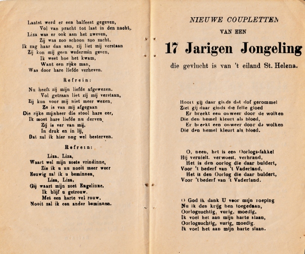 * Collectie straatliedjes, o.a. ‘Nieuwe Coupletten van een 17 Jarigen Jongeling die gevlucht is van’ t eiland St. Helena’. Dit lied verwijst naar de Tweede Boerenoorlog van 1899-1902, toen de Engelse overwinnaars maar liefst 6000 Boerengevangenen (onder wie generaal Cronjé en zijn vrouw) uit Zuid-Afrika naar het afgelegen eiland Sint-Helena overbrachten. Ook met ‘Nieuwe Coupletten van Het Kind van Holland’ (het eerste van de vier in dit liedblaadje), ‘Liza de Ontrouwe’ en ‘Het stervende Meisje of Klacht eens Jonglings’.