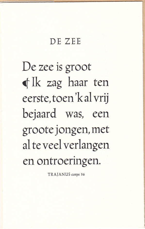 * Met ‘beste wensen’ van de drukker, in potlood. Gedrukt voor het margedrukkersproject De Grote Nederlandse Letterproef. Dit is een van de 26 op de pers geletterde exemplaren (V) die van een omslag werden voorzien en bestemd waren voor vrienden en relaties van de pers. De letter Trajanus is ontworpen door de Amerikaan Warren Chappell en in 1939 uitgebracht. De verschillende lettergroottes van deze zeer decoratieve letter maken dit een bijzonder fraaie uitgave.