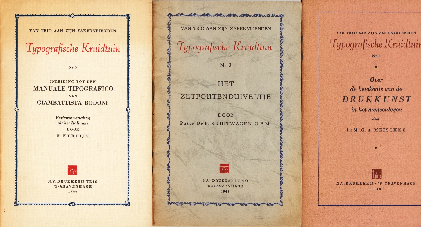 45. (TRIO). KERDIJK, F., Huib van KRIMPEN, B. KRUITWAGEN, Dick DOOIJES, Pam G. RUETER e.a. Typografische Kruidtuin. Complete serie in 10 deeltjes. Den Haag, Drukkerij Trio, 1948-1950. 16 x 10 cm. Geniet. 6-32 p. Geïllustreerd. 1e drukken. Zoals altijd iets verkleurd.