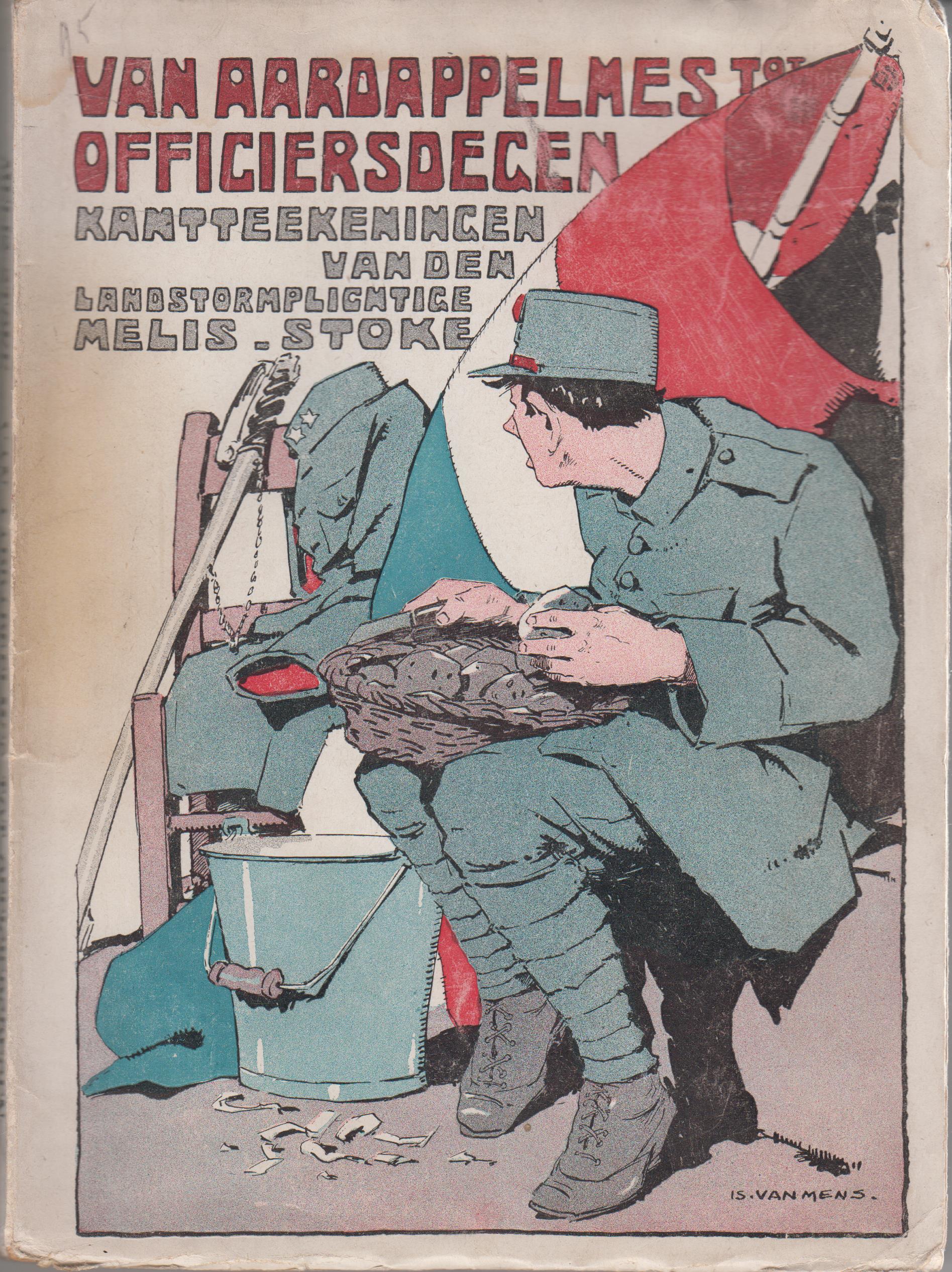 34. STOKE, Melis Van aardappelmes tot officiersdegen. Uit het dagboek van een landstormplichtige. Illustraties van I. van Mens, Henri van de Velde e.a. Amsterdam, Van Holkema & Warendorf, 1917. Ingenaaid met prachtig omslag van Is. van Mens. 140 p. 1e druk. Overstekende papierranden iets gekreukt, maar een zeer gaaf en fris exemplaar van een buitengewoon kwetsbare titel. Naam op p. 3.