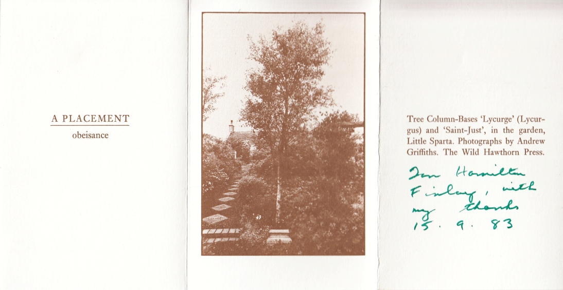 * Gesigneerd bewijs van dank door de dichter: ‘Ian Hamilton/ Finlay, with/ my thanks/ 15.9.83′ in groene fijnlijner geschreven – dank voor steun in de strijd tegen lokale overheden die de beeldentuin wilden aantasten. Twee foto’s van met een zuilbasis aangeklede bomen in Little Sparta, de tuin van de Schotse dichter en tuinkunstenaar Ian Hamilton Finlay (1925-2006).