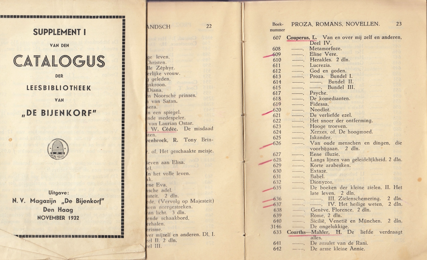 1. BIJENKORF, De Catalogus leesbibliotheek “De Bijenkorf”. Met 4 supplementen. Den Haag, N.V. Magazijn De Bijenkorf, 1932-1934. Ingenaaid. 442; 24; 24; 20; 24 p. 1e druk. Voorzijde omslag ontbreekt. Eerste katern los. Met notities van een enthousiaste bibliotheekconsument en rode potlood-onderstrepingen. Oud provisorisch omslag.