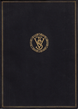 * Voorop monogram TJVS met rouwkrans, in zilver, door S.H. de Roos, die ook verantwoordelijk was voor de gave vormgeving van dit stemmige rouwboek voor de overleden directeur van de Lettergieterij, geschreven door zijn collega-directeur.