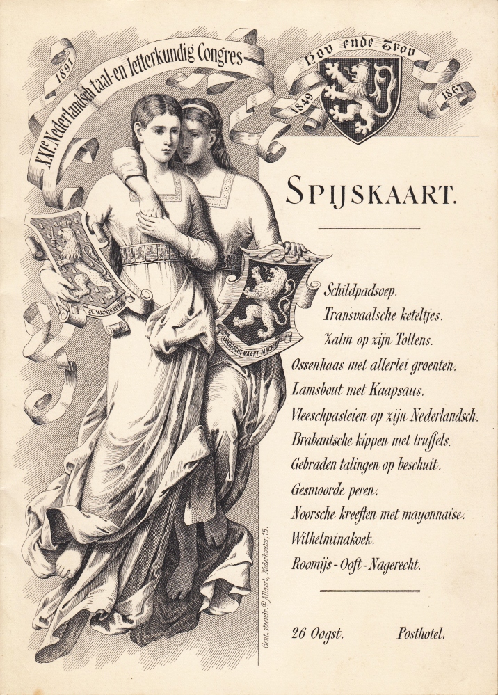 * Menu van een zeer Nederlandslievend congres, waar (volgens de kranten) tweetaligheid als schadelijk werd weggehoond door het uit Vlaamse, Zuidafrikaanse en Nederlandse hooggeleerden en literatoren bestaande publiek. Het vond plaats te Gent eind augustus 1891. Op het menu onder andere ‘Transvaalsche keteltjes’, ‘zalm op zijn Tollens’, ‘Lamsbout met Kaapsaus’, ‘Gebraden talingen op beschuit’ en ‘Wilhelminakoek’. Interessant en veelzeggend.