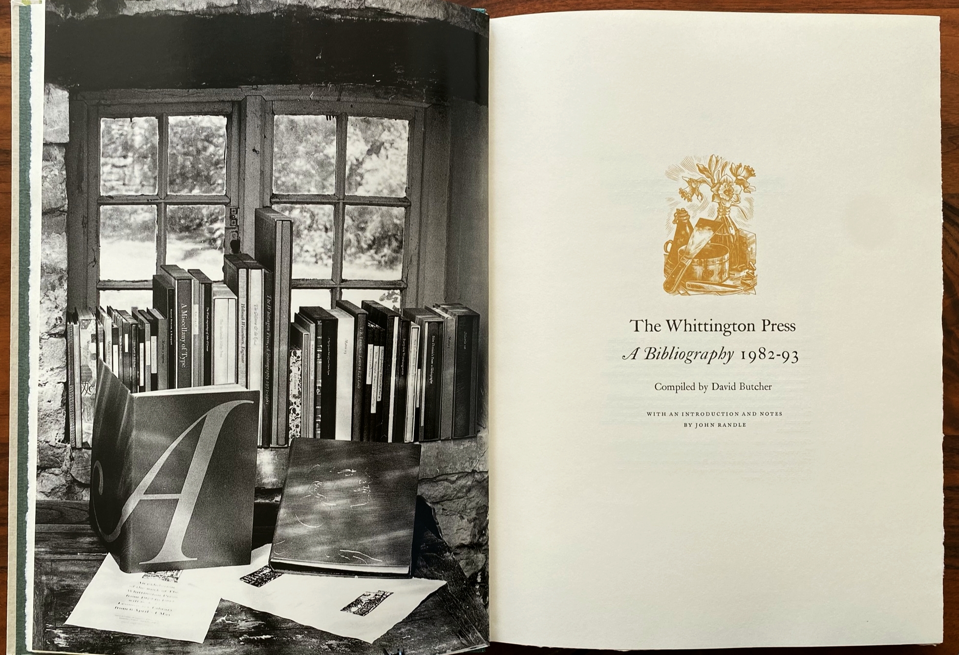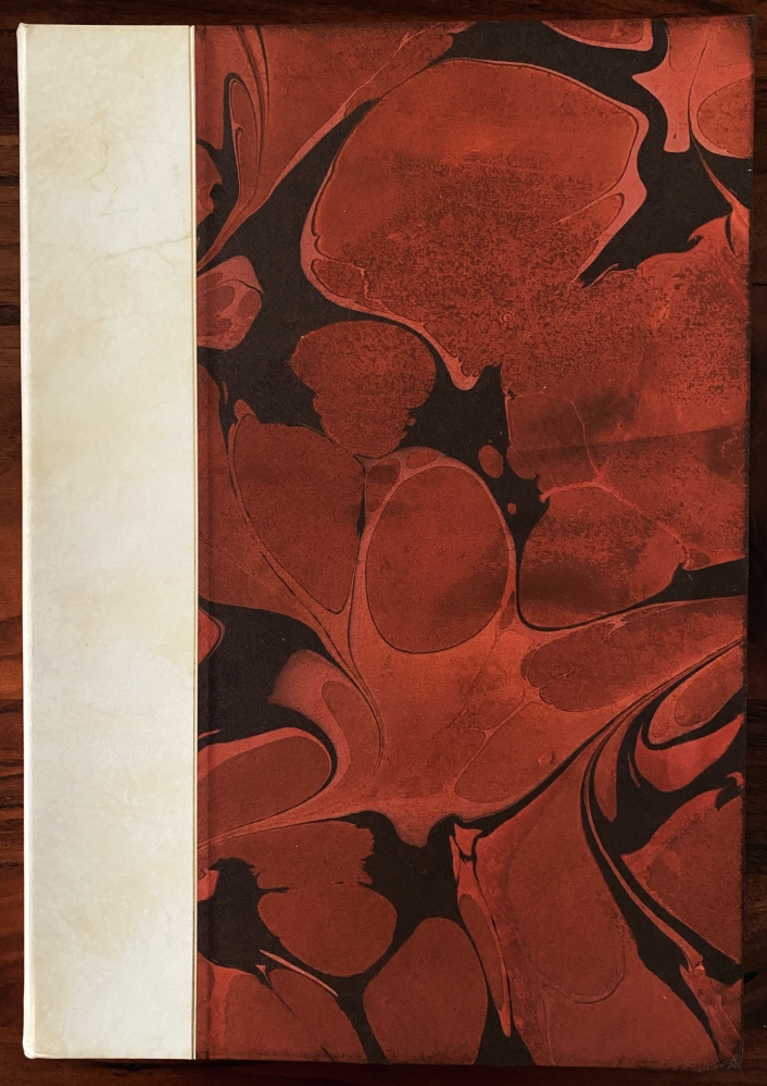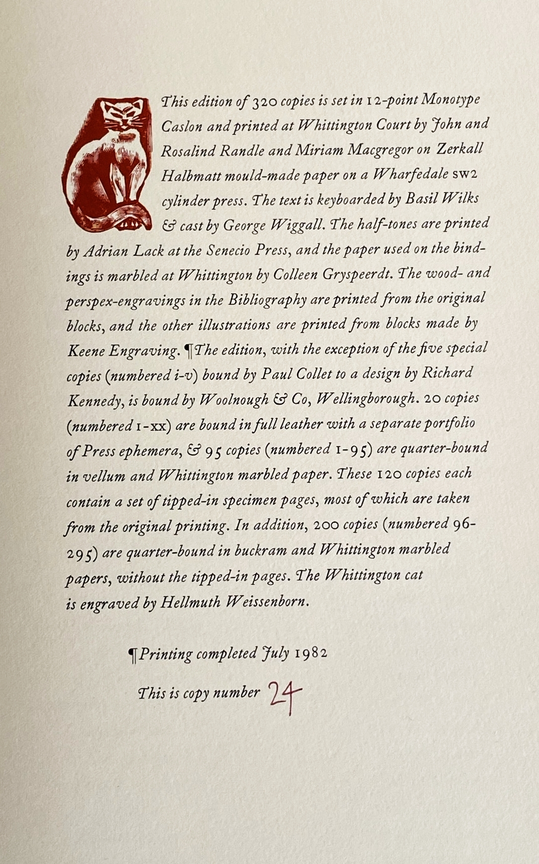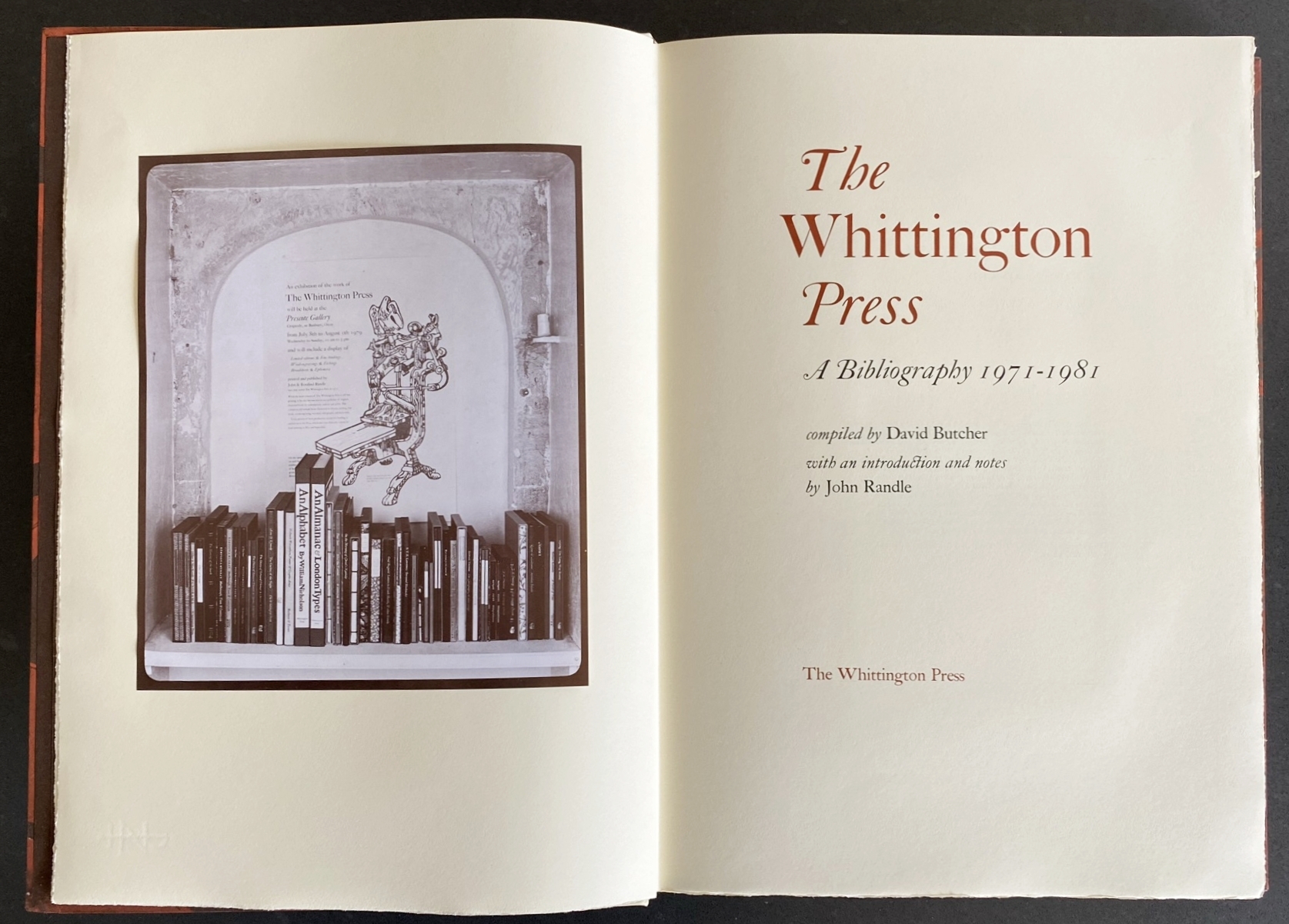 44. (WHITTINGTON PRESS)The Whittington Press, A Bibliography 1971-1981. Compiled by David Butcher. With an Introduction and Notes by John Randle. Andoversford, Gloucestershire, The Whittington Press, 1982. 39 x 27 cm. Halfperkament met rood-zwart gemarmerde platten (Woolnough & Co., Wellingborough) met foedraal. (12), 88 p., 50 bl. met opgeplakte extra’s (illustraties, proeven, monsters), 2 bl. Met gedrukte illustraties (van de blokken, waar van toepassing), een ingeplakte letterproef in groot formaat, en ingeplakte foto’s. Gezet met (o.a.) de 12-punts Monotype Caslon en gedrukt in wijnrood en zwart bij de Whittington Press in 320 genummerde exemplaren op getint geschept Zerkall Halbmatt-papier. Het marmerpapier van de band werd vervaardigd door Colleen Gryspeerdt. 1e druk. Mooi exlibris in houtgravure van D. de Jong. Foedraal met een butsje, maar verder een prachtexemplaar.