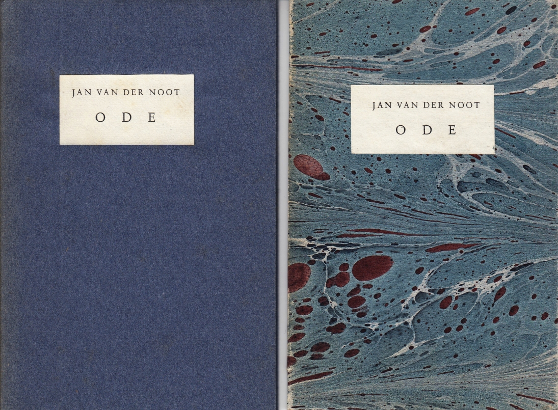 23. NOOT, Jan van der Ode teghen d’onwetende vyanden der poëteryen van Marcvs van Wonsel. Amsterdam, (Vijf Ponden Pers), 1944. 16 x 10 cm. Ingenaaid met omslag en titeletiket. (20) p. Gezet uit de Civilité en de Romanée en gedrukt in een oplage van 55 exemplaren op geschept papier van Barcham Green door Joh. Enschedé.