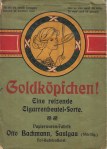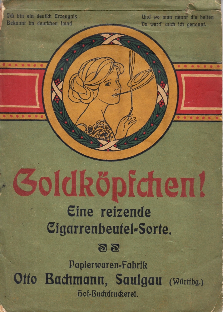 32. (SIGARENZAKJESREKLAME). BACHMANN, Otto Goldköpfchen! Eine reizende Cigarrenbeutel-Sorte. Saulgau (Württbg.), Papierwaren-Fabrik Otto Bachmann, CA. 1900. 17 x 12 cm. Met prachtig omslag en uitleg op een aparte pagina. Wat verbruind en lichte slijtage.