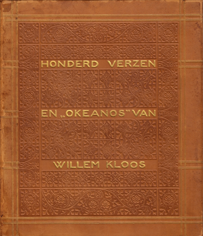 15. KLOOS, Willem Honderd verzen en Okeanos. (Met een originele ets (portret van Kloos) door Willem Witsen). Amsterdam, [W. Versluys], 1909. Origineel kalfsleer met goud- en blindstempeling naar ontwerp van Theo Nieuwenhuis. Alle sneden verguld. (8), 134 p. Gedrukt in een beperkte, genummerde oplage (dit is nummer 91) op Japans papier. 1e druk. Aan de randen wat lichte slijtagesporen.