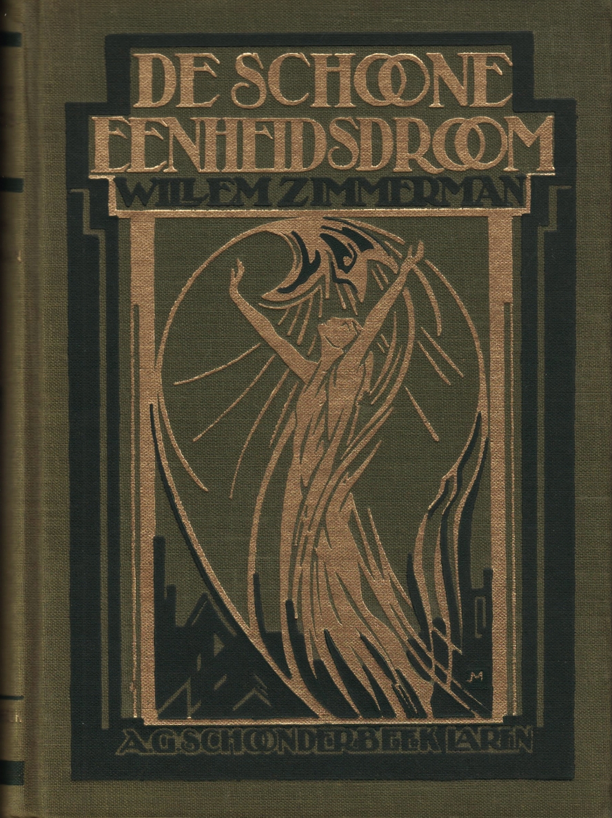 47. ZIMMERMAN, Willem De schoone eenheidsdroom. Een roman. Laren, A.G. Schoonderbeek, [1925]. Gedecoreerd linnen (goud en donkergroen op lichtgroen). 228, (12) p. 1e druk. Rug wat verbleekt, maar een mooi exemplaar.