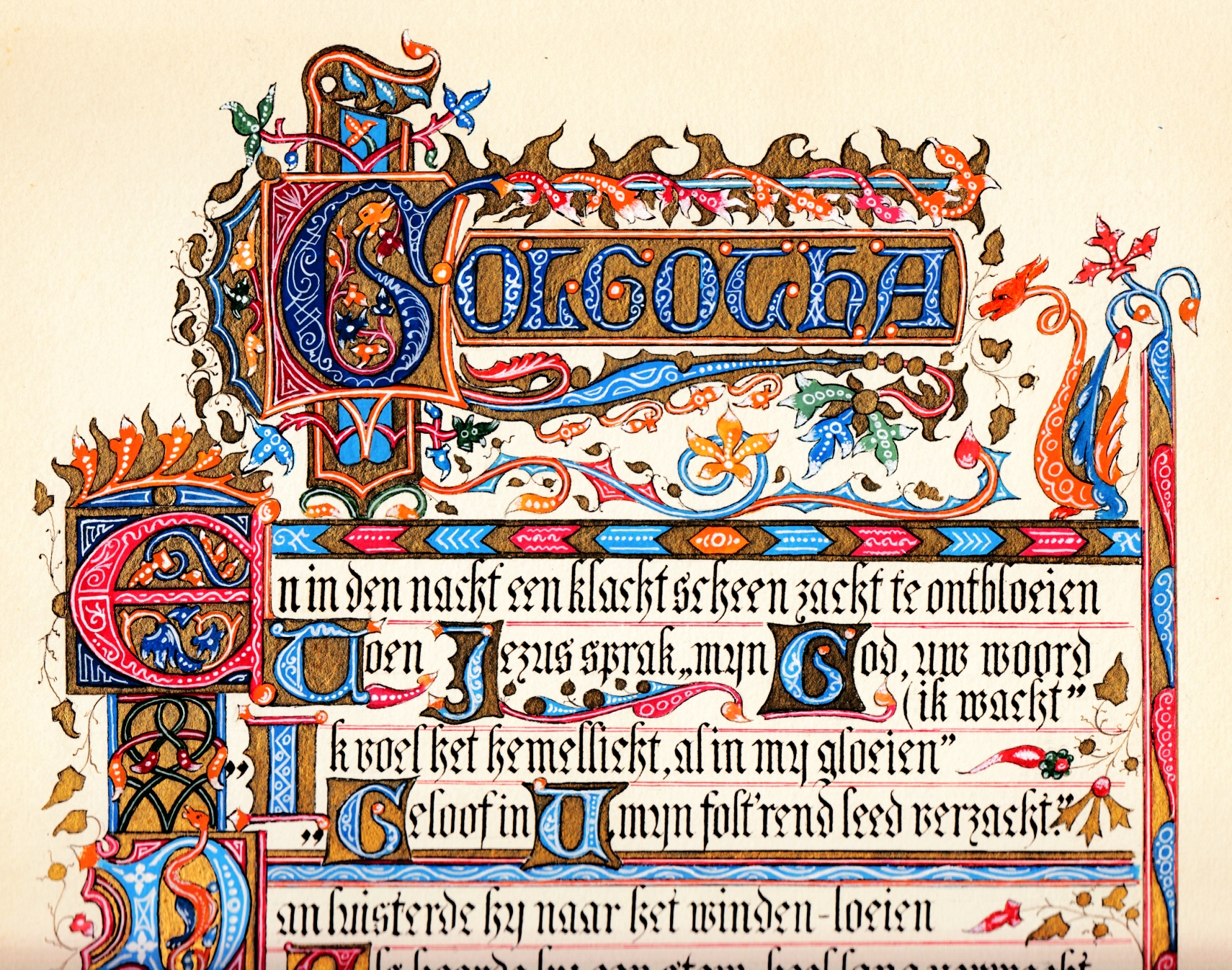 23. (KALLIGRAFIE). SCHÜRMANN, Jules Golgotha. Kalligrafie van de hand van Johan Carel Bautz (1840-1912), waarschijnlijk ca. 1910. Eén blad, 42 x 28 cm, eenzijdig beschreven. Gesigneerd door Bautz in de linker onderhoek. Met goud en vele kleuren op neogotische wijze schoongeschreven gedicht van Jules Schürmann. Aan de randen iets verbruind. Aan de randen iets verkleurd, links boven is een paar vierkante millimeter afgescheurd. Maar de kalligrafie zelf is perfect bewaard gebleven, effectief onverkleurd, met mooi dof goud.