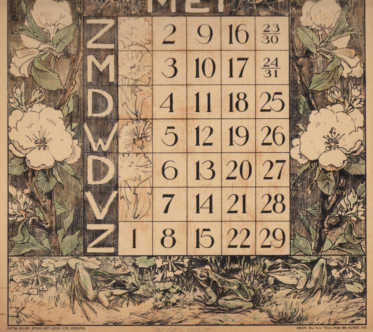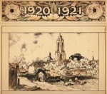 * Op het achterblad staat ‘1870-1920 Jubileum kalender’, maar deze loopt van mei 1920 tot april 1921. Steeds met een dorpsgezicht of landelijke scène bovenaan, en door het seizoen geïnspireerde rijke natuurversiering rondom de maand: bloemen, planten, vogels, kikkers. Zeer aantrekkelijk.