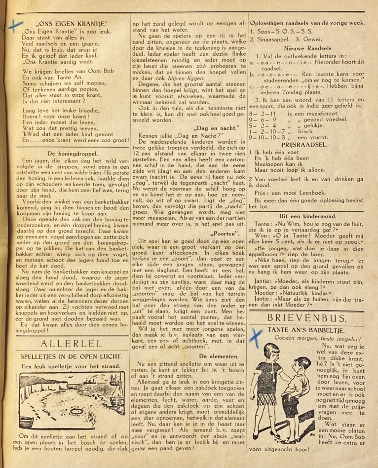 * Voorin in inkt geschreven ‘A. Croockewit-Ennema’/ “tante An”/ s.f Tjepper’. Anna Croockewit-Ennema (1896-1975), woonachtig bij suikerfabriek Tjèpèr (Yogyakarta) was dus de schrijfster van de vele bijdragen in dit blad geschreven onder de naam ‘Tante An’. Zoals het vermakelijke feuilleton ‘De avonturen van Poentje’ (‘een klein lollig hondje’). Ook met strips, malle moppen, inzendingen met antwoorden en allerlei leerzaams voor het in Ons Indië woonachtige kind.