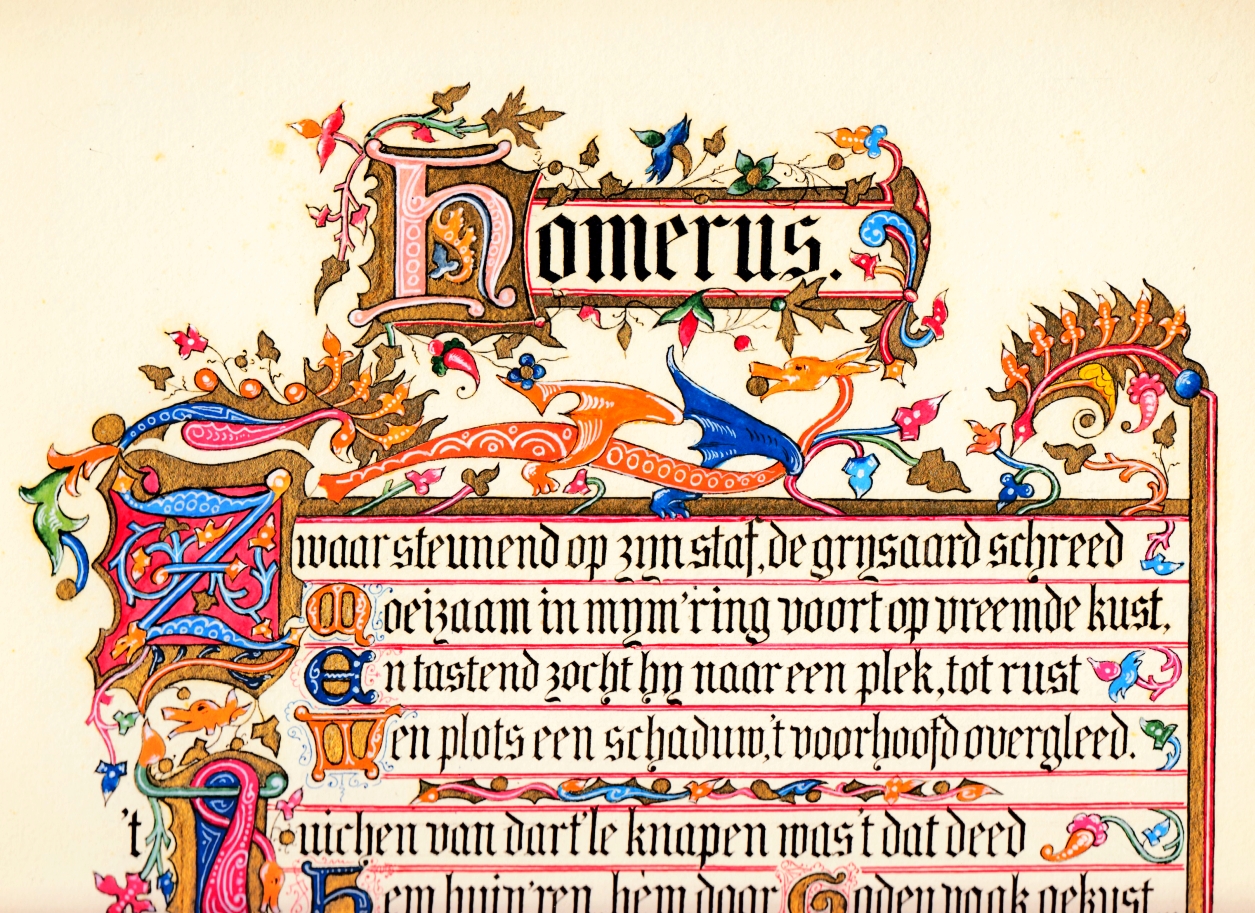 * Sonnet over de blinde bard en de ‘dart’le knapen’, wier gejuich hem deed ‘huiv’ren, hèm door Goden vaak gekust…’ In gedragen taal wordt een ongekend leed gesuggereerd dat het verlies van zijn ogen en de grootheid van zijn kunst veroorzaakte. De mooi geschreven tekst is versierd met vierkante, door en door versierde initialen omspeeld met vrolijke draakjes, gouden blaadjes en stippels. Verbazend!