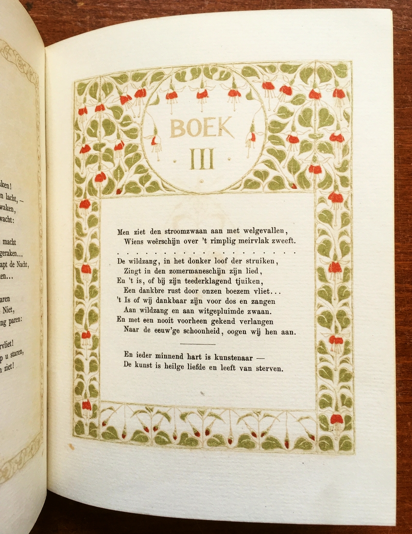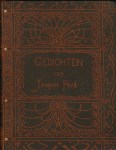 16. PERK, Jacques Gedichten. Met Voorrede van Mr. C. Vosmaer en Inleiding van Willem Kloos. (..) Vercierd door T. Nieuwenhuis. Amsterdam, Van Looy, 1897. Origineel gebatikt linnen met art-nouveauversiering ontworpen door Nieuwenhuis). (2), 198 p. Met schutbladen, lithografieën in lichte kleuren en kaders (40 verschillende sierranden) van Theo Nieuwenhuis. 2e druk. Mooi exemplaar, maar met een haarscheur in de buitenkneep die je nauwelijks ziet, en een naam voorin: J. Wichers Hoeth (zij was een familielid van Joshua van der Poorten Schwartz, alias Maarten Maartens), verder vrijwel zonder de gebruikelijke problemen.