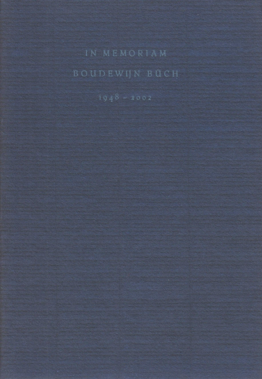 21. BÜCH, Boudewijn In memoriam Boudewijn Büch 1948-2002. (Met een portret van Büch in linosnede door Peter Bekker). [Geesbrug], Sub Signo Libelli, 2003. Ingenaaid. (16) p. Met de hand gezet uit de Meidoorn en gedrukt in zwart en blauw op handgeschept papier van Barcham Green in een oplage van 76 genummerde exemplaren. 1e druk.