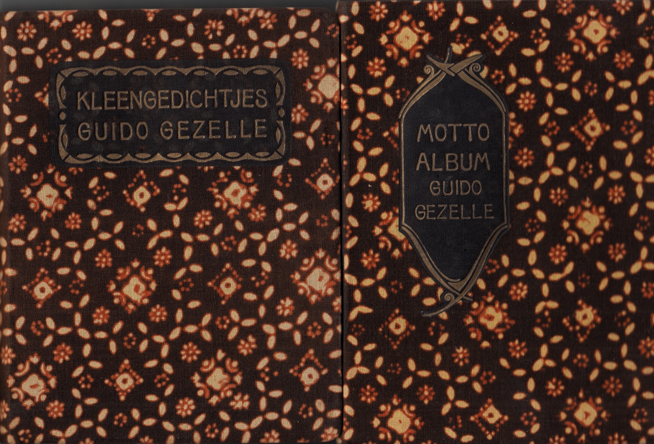 13. GEZELLE, Guido Twee uniform gebonden batikbandjes: Kleengedichtjes (I-II) en Motto-album. Amsterdam, L.J. Veen, ca. 1925. 13 x 10 cm. Batikbandjes in bruin en crème met uitgespaarde titels. (248); 192 p. Alle pagina’s in kader. Bandjes netjes, maar van Kleengedichtjes ontbreekt het eerste schutblad. Naam voorin het Motto-album.