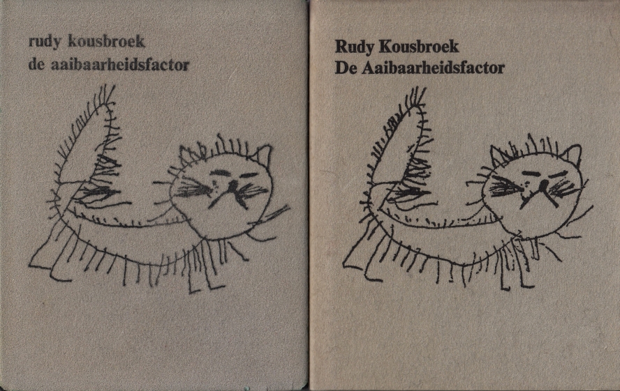 16. KOUSBROEK, Rudy De aaibaarheidsfactor. Amsterdam, Thomas Rap, (1969-1979). Linnen met aaibaar stofomslag. 80-120 p. Met tekeningen van Hepzibah Kousbroek en andere illustraties. 1e (2 x), 2e, 5e geheel herziene en (met Die Wacht am IJskast én een rugtitel) uitgebreide, 6e en 8e druk. Sommige exemplaren wat voorgeaaid.