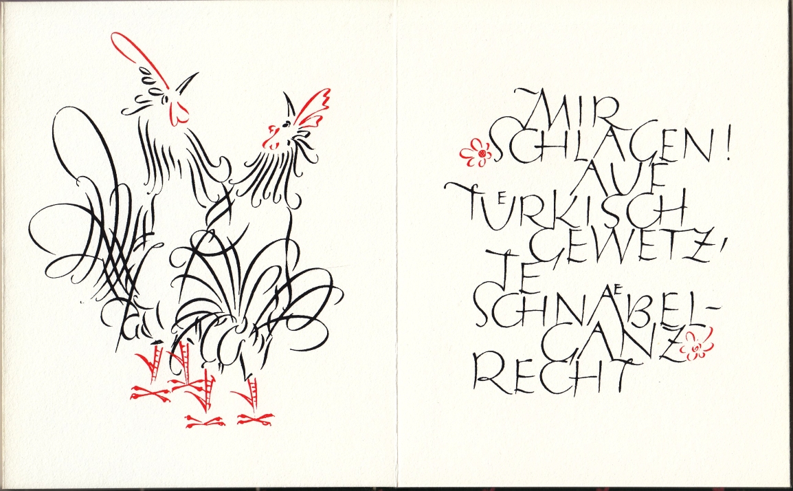 25. NEUGEBAUER, Friedrich Das Duell von Adolf Holst. Bad Goisern, Studio Neugebauer, 1977. Linnen op zijn poeziealbums, met rode linten. Leporello met 16 eenzijdig in rood en zwart in zeefdruk uitgevoerde bladen. Oplage 99 genummerde exemplaren. 1e druk. Keurig.