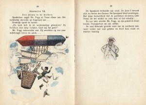 * Ook in dit exemplaar zijn álle 113 geestige tekeningen met de hand door de schrijver gekleurd. Met enkele toelichtingen in zijn handschrift: op de titelpagina’s schreef hij ‘Geïllustreerd door den Schrijver’ en voorin beide boeken welke schrijvers geparodieerd werden: ‘Louis Couperus/ Bosboom Toussaint, van Lennep, Schimmel/ Marie Corelli/ Marryatt/ Gustave Aimard/ Agatha/ ?’ en ‘Arthur van Schendel/ Jules Verne/ [H.G.] Wells/ Alexandre Dumas père/ E.Th.A. Hoffmann/ Wilde-Strauss/ van Riemsdijk’. De meeste tekeningen zijn met waterverf van allerlei kleuren voorzien, in het geval van Van Schendel ook met goudverf. Cornelis Veth (1880-1962) schreef humoristische teksten en maakte veel karikaturen. In dit geval combineerde hij beide.