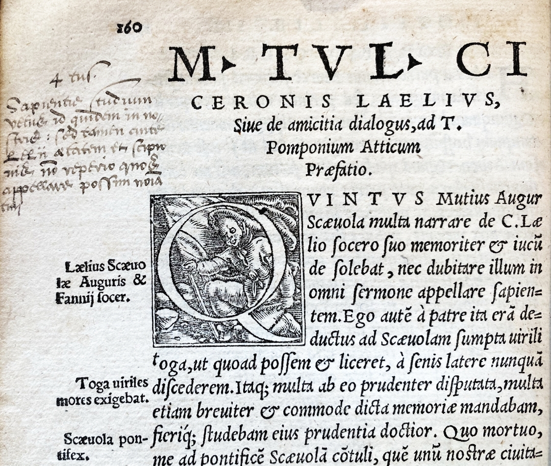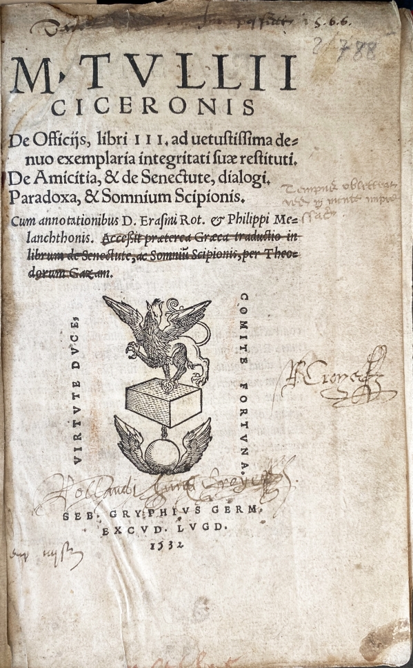 3. CICERO, Marcus Tullius M. Tullii Ciceronis De officijs, libri III. ad vetustissima denuo exemplaria integritati suae restituti. De Amicitia, & De Senectute, dialogi, Paradoxa, & Somnium Scipionis. Cum annotationibus D. Erasmi Rot. & Philippi Melanchthonis. (Doorgestreept: Accessit praeterea Graeca traductio in librum de Senectute, ac Somnium Scipionis, per Theodorum Gazae). Lyon, Sebastianus Gryphius, 1532. Genaaid op touw, voorzien van gemarmerde schutbladen (18e eeuw?) maar zonder boekband. (64), 264 p. Enige slijtage aan de buitenkant. Met verschillende inscripties uit de 16e eeuw (in civilité-letter geschreven) en , o.a. een naam ‘Hollandi Sum Croyer’ en een handtekening ‘A. Croyer (?)’. Bij het begin van de tekst zelf (p. 1) enkele 16e-eeuwse notities, waaronder een eigenaarsnaam, een priester Jacobus Tavirnus Movarnensis (ongeveer), die ook verschillende geleerde marginalia heeft toegevoegd.