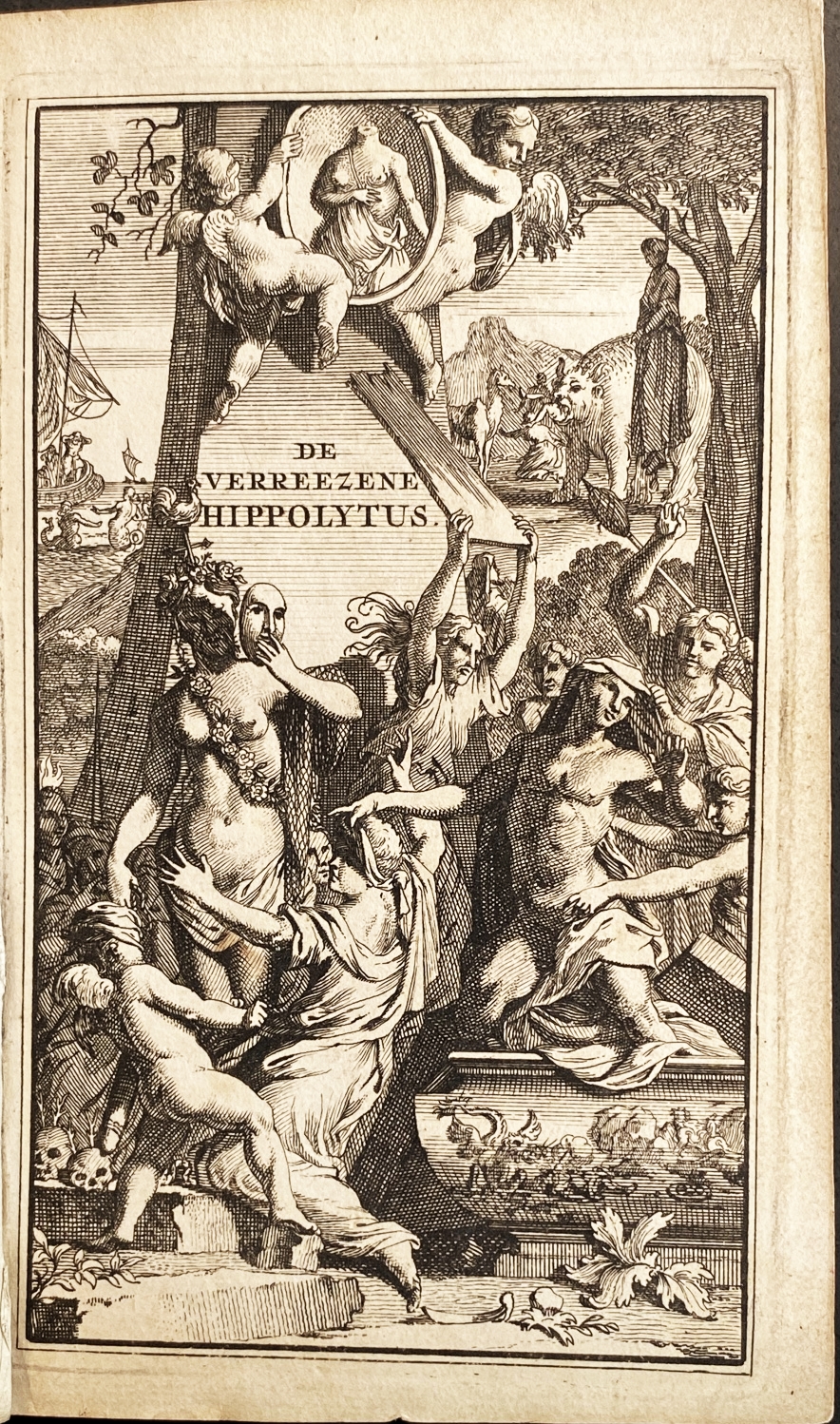12. VROUWEN De verreezene Hippolytus, ontdekkende de natuur, eigenschappen, toomelooze hartstochten, onkuische liefde, en ydelheid der vrouwen. Bekrachtigt zo door aaloude als hedige geschichten, en voorbeelden; ook met omschryfelyke aanteikeningen verrykt. Beneffens een Koeldrank voor de minzieke malle vryers. Met konstplaaten versiert. Amsterdam, Jacob van Royen, 1710. 18e-eeuws half kalfsleer (16), 302 p. Met gegraveerde titel en 6 gravures buiten de tekst plus 9 tekstgravures. Op de titelpagina is de naam geschreven van Constantinus Maria Michaël Nanteuil, Antv. 1780 (een Antwerpse advocaat, geboren in 1758/59).