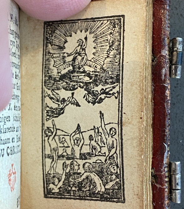 10. MINIATUURBIJBEL Kern des Bybels. Den Haag, A. de Groot & Zoonen, 1750. 45 x 31 mm. Rijkverguld rood heelleer met zilveren slotjes (Eerste Stadhouderlijke Binderij). Schutbladen met kammarmer. 80 p. Alle sneden verguld. Met 7 illustraties. Gedrukt in rood en zwart. 1e druk. Dit boekje is in zeer goede conditie, alleen met wat slijtage op de rug.