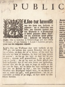 1. ANONIEME BRIEF Alsoo tot kennisse van den Hove van Hollandt is gekomen, dat in November van desen jare seventien hondert tien van Dordrecht in ’s Gravenhage is bestelt geworden sekere Brief, met een onbekende handt geschreven, hebbende dit volgende opschrift: Om te bestellen in Schravenhage aen men Heer Wassenaer, of aen Susanna v. Leyde v. Leeven por por’. [Den Haag], zonder uitgever, 1710. Aanplakbiljet, getekend in den Rade (van het Hof van Holland, Zeeland en West-Friesland), D.P. van Assendelft. 20 x 26 cm. Grote initiaal A. Uit convoluut. Papercliproest, notities in potlood (‘Politie’).
