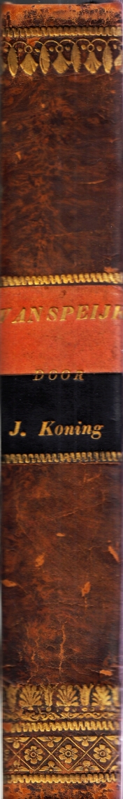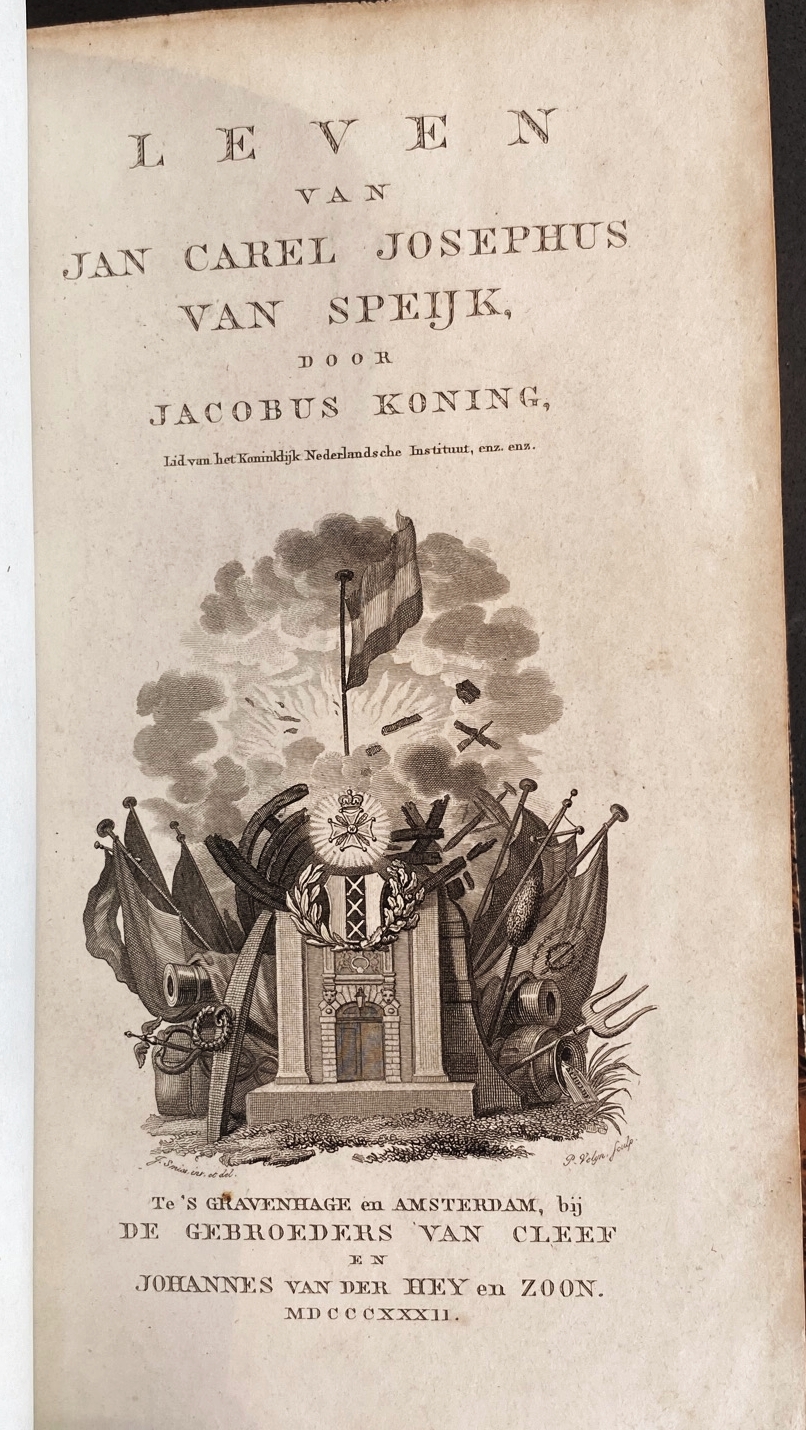* Mooi boek met een op ’28 April 1832′ gedateerde, handgeschreven opdracht van de beide zonen van de schrijver aan David van Lennep, hoogleraar klassieke talen, de vader van auteur Jacob van Lennep. Jacobus Koning (1770-1832) was boekhandelaar. Ofschoon niet welgesteld, wist hij een omvangrijke bibliotheek van boeken en manuscripten aan te leggen. Over de heldendaad van Jan van Speyk, die zich met zijn kanonneerboot op 5 februari 1831 opblies om niet in de handen van de Belgen te vallen, schreef hij dit omvangrijke en van uitputtende bijlagen voorziene boekwerk. De publicatie maakte hij niet meer mee, hij overleed op 2 april 1832 – vandaar de opdracht van zijn zonen ‘door wijlen den Schrijver toegedacht’ aan de Weledelgeboren Hoogwelgeleerden Heer Mr. D.J. van Lennep’.