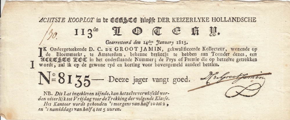 * Ondertekend (stempel): D.C. de Groot Jamin. Diederik Casper de Groot Jamin (1759-1813) maakte deel uit van een familie van loterijpachters. Jan de Groot was zijn schoonvader, hij zat ook in de loterijbusiness, en had familieleden in de boekhandel. Dat watermerk in elk loterijbriefje was dus niet toevallig. Dit is een lot uit de voorloper van de Staatsloterij, onder Lodewijk Napoleon, de eerste koning van Nederland (1806-1810).