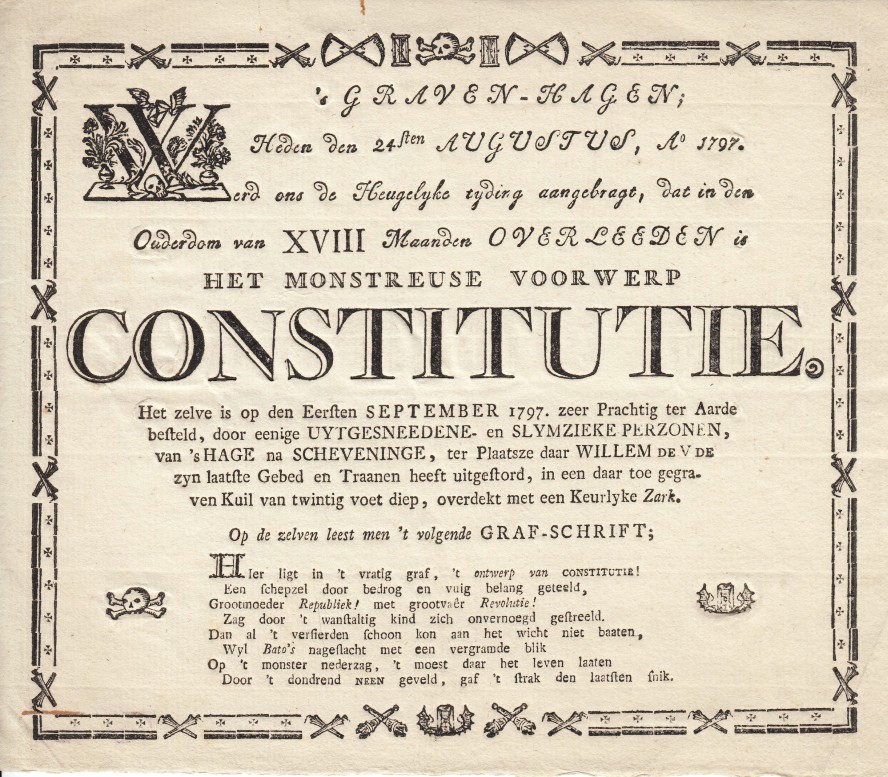5. GRAFSCHRIFT VAN DE CONSTITUTIE ‘s-Graven-hagen; Heden den 24sten Augustus, Ao 1797, werd ons de Heugelijke tijding aangebragt, dat in den ouderdom van XVIII Maanden overleeden is het Monstreuse Voorwerp Constitutie. Het zelve is op den Eersten September 1797, zeer Prachtig ter Aarde besteld, door eenige Uytgesneedene- en Slymzieke Perzonen (…). Anoniem, 1797. 18 x 21 cm. In sierkader met verschillende lettertypes gedrukt, voorzien van een rouw-initiaal W met schedel, een vignetje van een schedel met botten en een van een gevleugelde zandloper. Op goed papier gedrukt, zeer gaaf en fris.