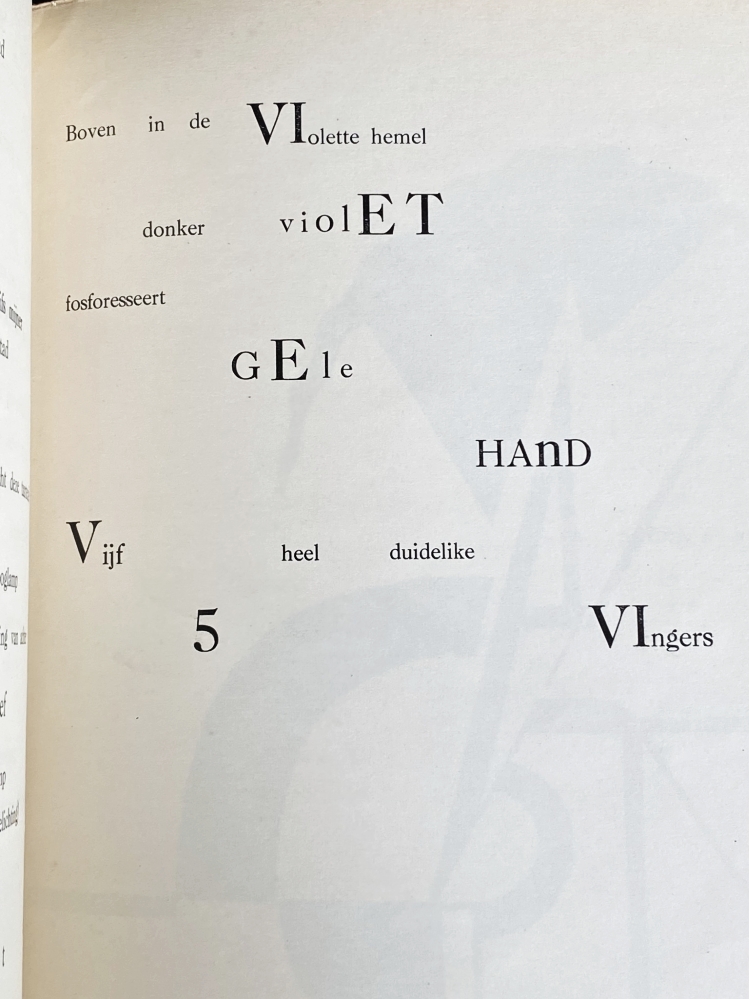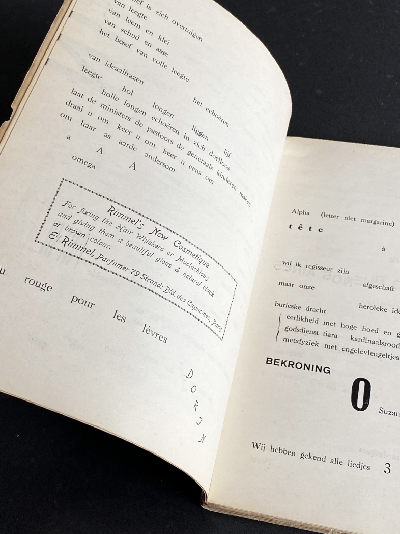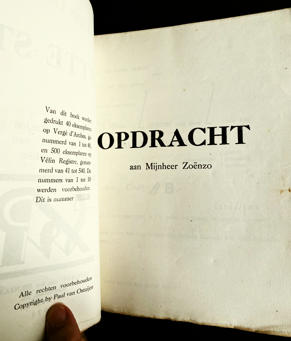 * Van de belangrijkste exponent van de avantgarde in het Nederlandse taalgebied is dit éen van de slechts 40 luxe-exemplaren, gedrukt op Vergé d’Arches! Ongenummerd exemplaar (volgens de overgeleverde verkooplijst van 26 augustus 1921 bleven elf exemplaren van de veertig ongenummerd (lees: nog onverkocht tot en met augustus 1921)). Van deze luxe-editie kwamen slechts dertig exemplaren in de handel: de eerste tien waren voorbehouden aan auteur, medewerkers en vrienden. Voorzijde omslag (als altijd) wat vuil, achterzijde omslag vuil; het voorblad van de omslag ligt bijna los, enkele hapjes uit rechterzijde vooromslag, breuk in en enkele hapjes uit de rug. Redelijk exemplaar van buiten, goed tot uitstekend exemplaar van binnen. Completely unrestored copy!