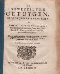 71. PAMFLET De onwettelyke getuygen, George Jeffreys Cancelier en Robert Grave van Sunderland, President van de geheyme Raad van Jacobus de II. Coning van Groot-Britanje, en Secretaris van Staat: Nevens andere getuygen tegens malkanderen, in hunne gegeven Attestatien, over de Geboorte van den genaamden prince van Wales. Geconfronteert en ongregrond bevonden. Vrystad, Lieve van Waarmond, in de Waarheit, 1688. 19 x 15 cm. Zonder omslag, rugje oudtijds met blauw papier verstevigd. 32 p. Buitenste bladen iets verkleurd en met slijtsporen.