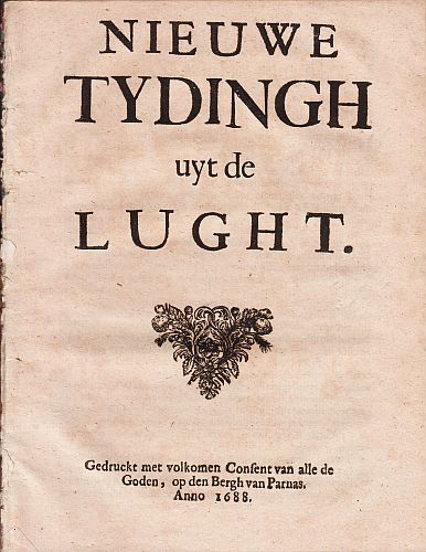 70. PAMFLET Nieuwe tydingh uyt de lught. Zonder plaats of uitgever (‘Gedruckt met volkomen Consent van alle de Goden, op den Bergh van Parnas’), 1688. 19 x 15 cm. Zonder omslag. 24 p. Mooi.