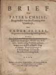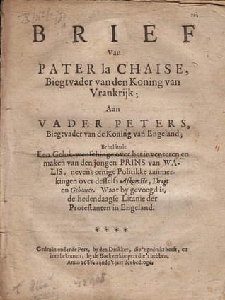 72. PAMFLET Brief van pater la Chaise, biegtvader van den koning van Vrankrijk; aan vader Peters, biegtvader van de koning van Engeland; behelsende een geluk-wenschinge over het inventeren en maken van den jongen prins van Walis, nevens eenige politikke aanmerkingen over desselfs afkomste, dragt en geboorte. Waar by gevoegd is, de hedendaagse litanie der protestanten in Engeland. Zonder plaats of uitgever (‘Gedrukt onder de Pers, by den Drukker, die ’t gedrukt heeft, en is te bekomen, by de Boekverkoopers die ’t hebben.’), 1688. Zonder omslag. 28 p. Wat stoffig en gevlekt, laatste 4 p. los, klein blanco hapje uit laatste blad.