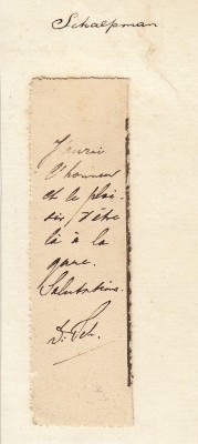86. SCHAEPMAN, H.J.A.M. Klein stukje handgeschreven tekst met paraaf. Verticaal reepje papier (88 x 25 mm), kennelijk van een ansichtkaart afgescheurd, met de tekst ‘J’aurai l’honneur et le plaisir d’être là à la gare. Salutations. D: Sch.’. Op een velletje papier geplakt waarop in oud handschrift ‘Schaepman’ geschreven is.