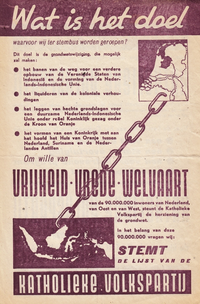 * Luxueus pamflet voor de Tweede Kamerverkiezingen van 1937, de laatste van voor de oorlog. ‘Nederland laat zich zijn hoogste geestelijke goederen mede door de Katholieke staatkunde in ons land veroverd en bevestigd, niet ontrooven, nu niet, nooit!’. ‘Geen valsche volksvoorlichting, geen holle leuzen, maar eerlijke, open verdediging van ons werk!’ Achterop de eerste zes kandidaten, onder wie Goseling en Aalberse, mét afbeelding van rood potlood en stembiljet. De R.K.S.P. zou veruit de grootste partij blijven, maar met een nog groter verschil dan in 1933.