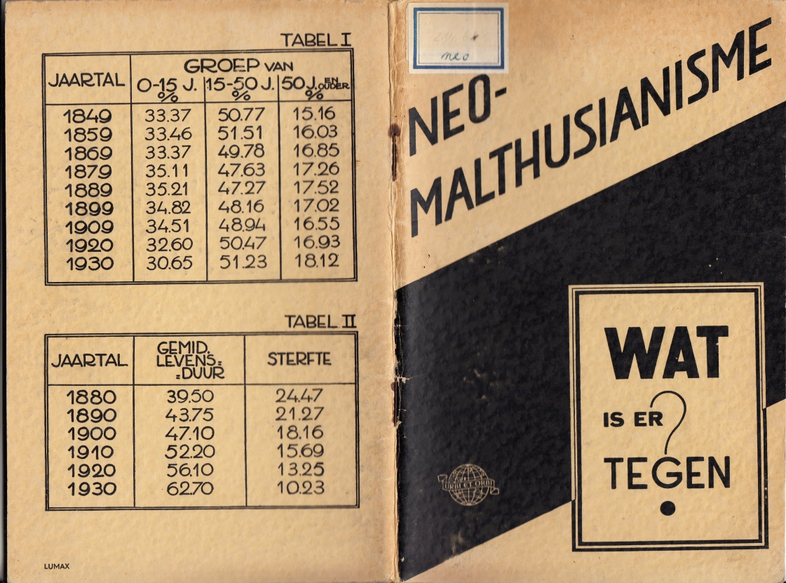 75. POMPE, W., SNOO, K. de, AUSEMS, A. (e.a.) Neo-Malthusianisme. Wat is er tegen? (Lezingen gehouden ter openbare vergadering te Utrecht op Vrijdag 27 Mei 1938). (Utrecht), Urbi et Orbi, (1938). Geniet. 48 p. Met grafieken. 1e druk. Rugje iets versleten. Plakzegel voorop.