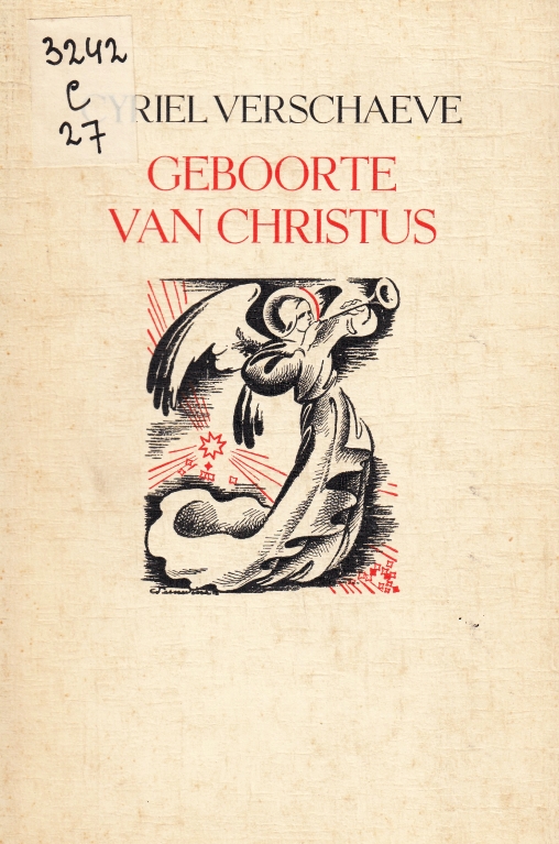 95. VERSCHAEVE, Cyriel Geboorte van Christus. Brugge, Zeemeeuw-Vereeniging, 1936. Ingenaaid met flappen. 64 p. Niet afgesneden. Titelvignet en illustraties van C.B. Teeuwisse. Gezet uit de Egmont en gedrukt (met initialen in rood) door J.W. Veltman. Bibliotheekexemplaar met plakker voorop en enkele stempels (niet op bedrukte pagina’s) van het Canisianum in Maastricht.