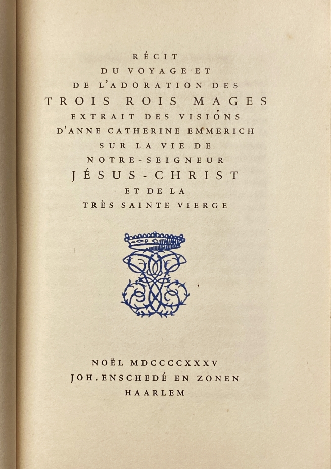 28. EMMERICH, Anne Catherine Récit du voyage et de l’adoration des trois rois mages. Extrait des visions d’Anne Catherine Emmerich sur la vie de Notre-Seigneur Jésus-Christ et de la très sainte Vierge. Haarlem, Joh. Enschedé & Zonen, 1935. Ingenaaid. (4), 36 p. Kerst- en nieuwjaarswens.
