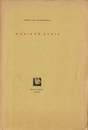 27. DUINKERKEN, Anton van Waaiend pluis. (Gesigneerd). [Den Haag], Mansarde Pers, [1944]. Ingenaaid. (16) p. Gezet uit de Libra (!) en gedrukt in geeloker en zwart op Ossekop-papier in een oplage van 700 exemplaren. Met een houtsnede en sluitvignet van R. de Paauw. 1e druk. Netjes. Naam voorin.