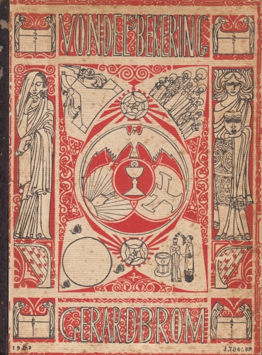 16. BROM, Gerard Vondels bekering. Amsterdam, E. van der Vecht, [1907]. Herbonden in halfinnen met origineel omslag van Toorop opgeplakt (achterkant gehavend). (8), 148, LXXXII p. Geïllustreerd. 1e druk. Roestig.