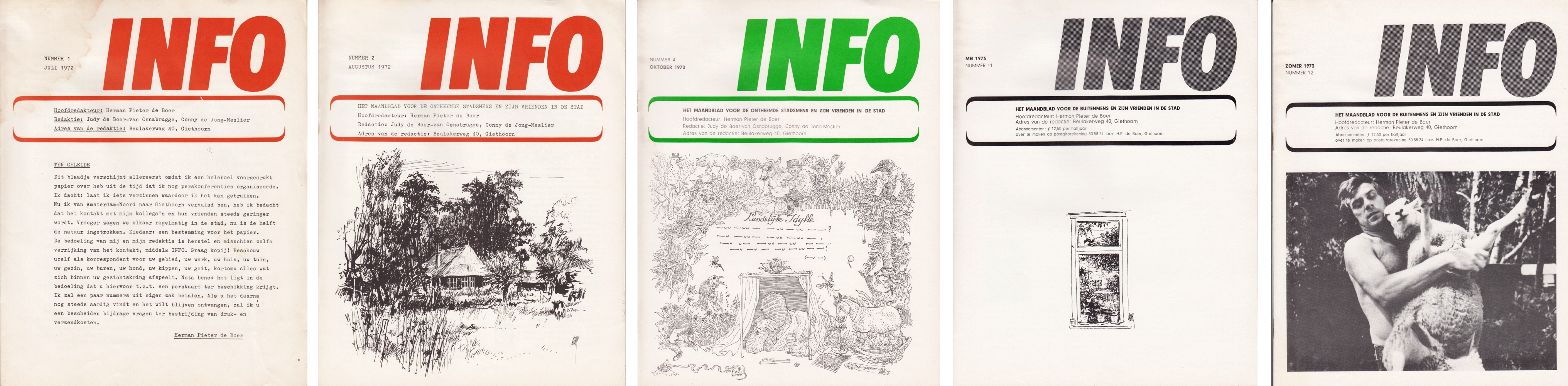 20. BOER, Herman Pieter de Info. Het maandblad voor de ontheemde stadsmens en zijn vrienden in de stad. Afl. 1-12, 14-17. Giethoorn, eigen beheer, juli 1972-winter 1973/74. Geniet. Geïllustreerd. Afl. 1 en 2 watervlek in linkerbovenhoek.