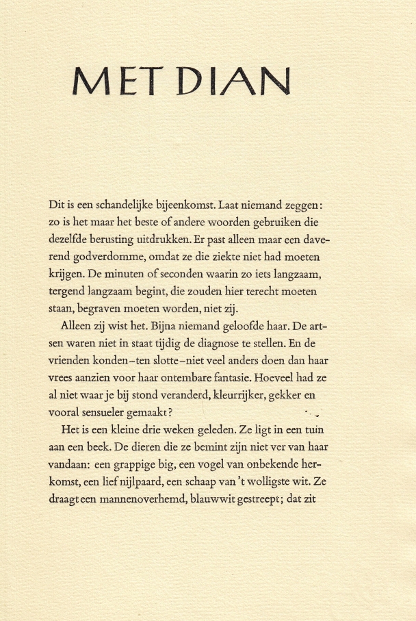 * Geweldige, ontroerende tekst in memoriam Dian Pouw (1943-1992), docent Duits en muziek, en dada-dame. Verfijnd drukwerk van Reinold Kuipers op een vel Hahnemühle.